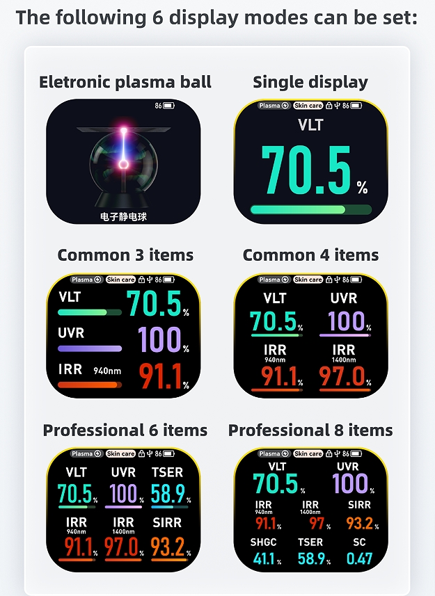 The Guoou solar film transmission meter offers six measurement modes to meet various measurement scenarios.