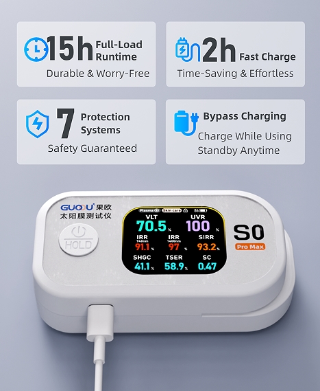 This function provides stores with an authoritative and immediate verification method to showcase product differentiation and gain customer recognition. The Guoou S0 Solar Film Tester supports lithium battery fast charging.
